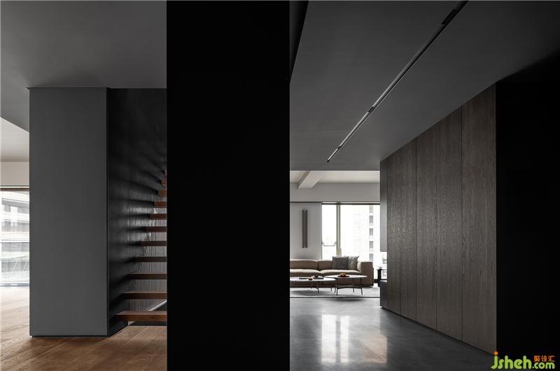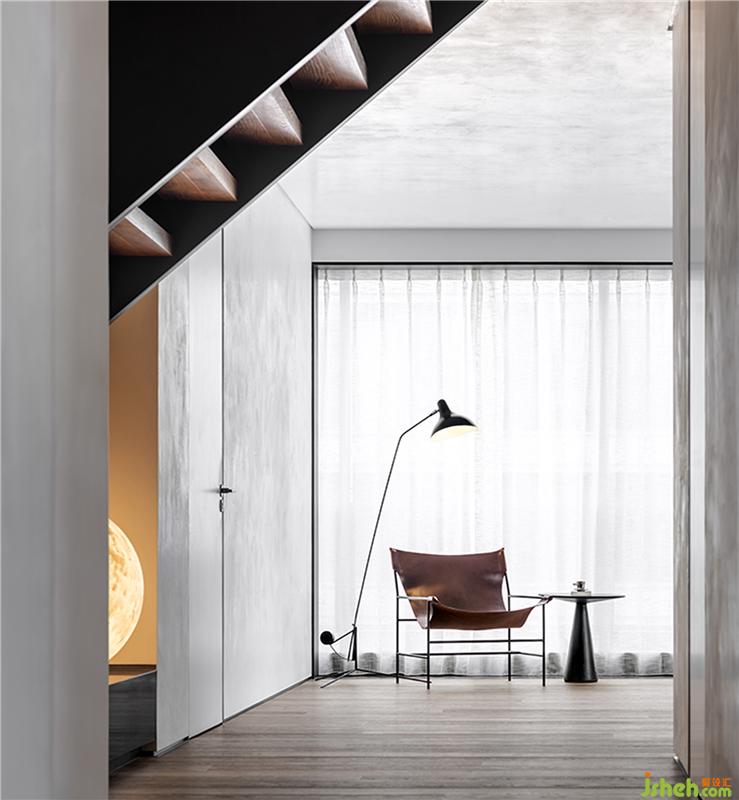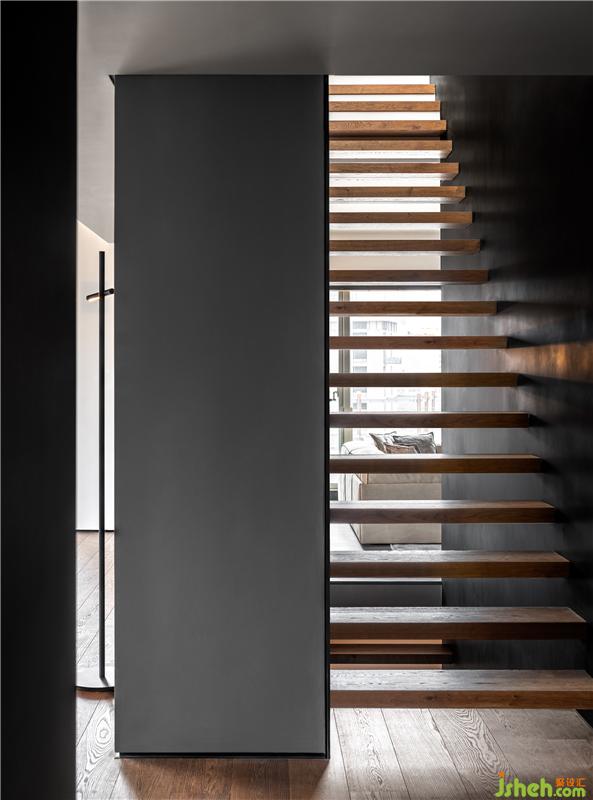 樓梯的位置經(jīng)過設計師多次反復調(diào)整,基于整體布局,以及對橫向、垂直樞紐便捷性的把握,最終確立其所在。木質(zhì)踏步的鏤空排列,呈現(xiàn)輕盈的懸浮感,又順暢的將光照引入,材質(zhì)的應用在冷暖調(diào)和中也顯得剛柔相濟。