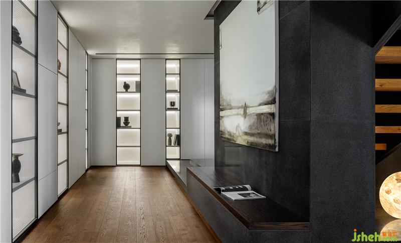 以層疊關系將樓梯銜接而下,并有效利用臺面的高度差,設置座位形式,兩側立面格架與柜體將實用與美感合二為一,藏秀并舉,這方樞紐也可作為樓下層的活動區(qū)域。