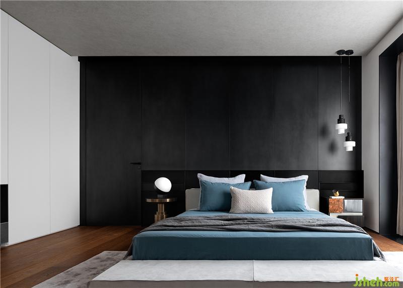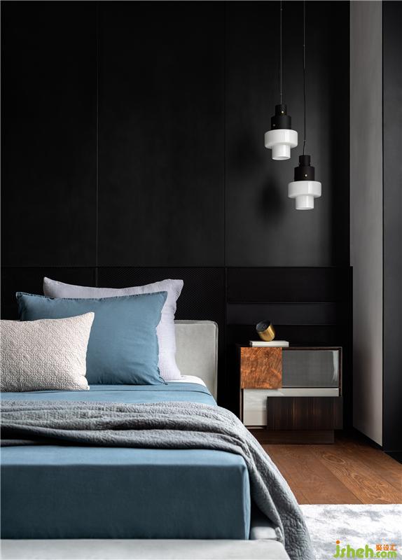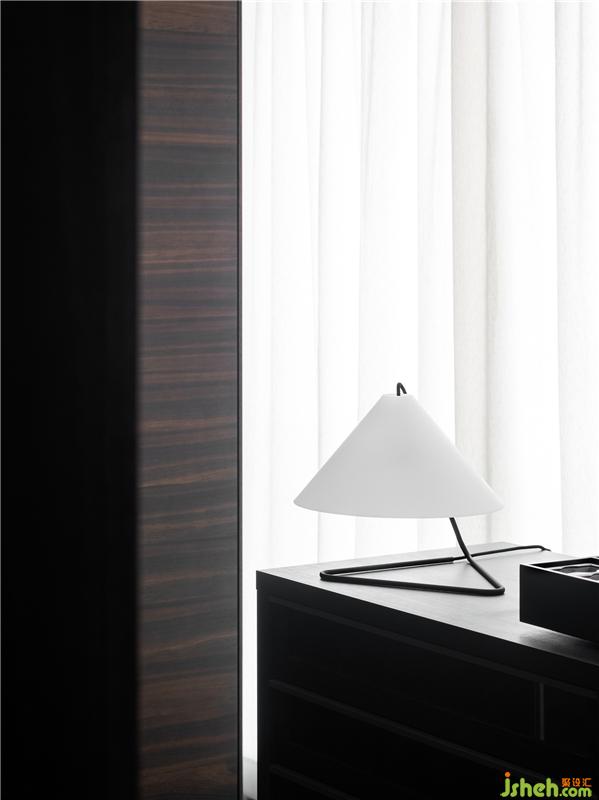 豪宅之所以“豪”,非但在于“大”,豐富的細節(jié)亦理應值得考究。主臥在點線面的排布中有著熟稔自如的轉(zhuǎn)換,在黑白灰的圍合中飽含深情。床頭采用方磊慣用的三角構成手法,既打破對稱式單調(diào),又構成了入室的視覺落點。所選取的燈飾本身也滲透著設計師的精巧心思,與臥室渾然相融,增添一抹柔情的點睛之筆。