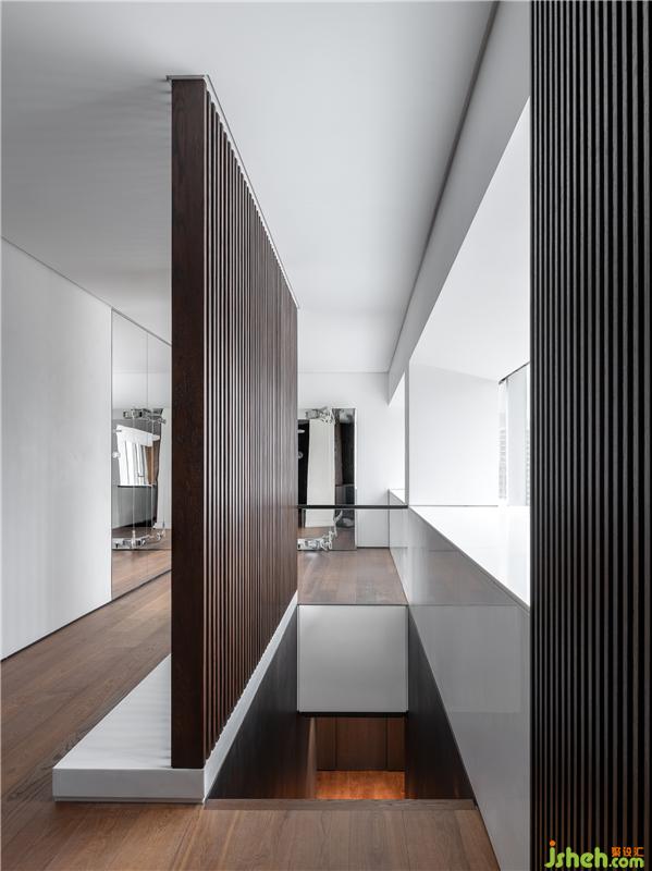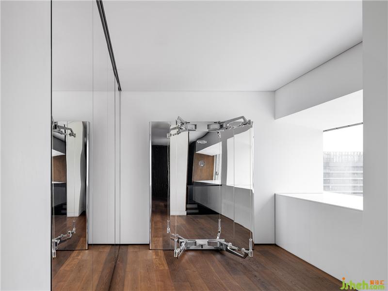 健身區(qū)域是為滿足家庭成員便捷高效的鍛煉需求。受建筑本身的限制,設計師在柜體內(nèi)解決設備并將風帶安放在側下方,實現(xiàn)對層高的最大化利用。在裝修設計層面,另一側的鏡面墻則把南外灘的景色映射入內(nèi),讓人運動時也能感受到室內(nèi)和室外的自然交融。