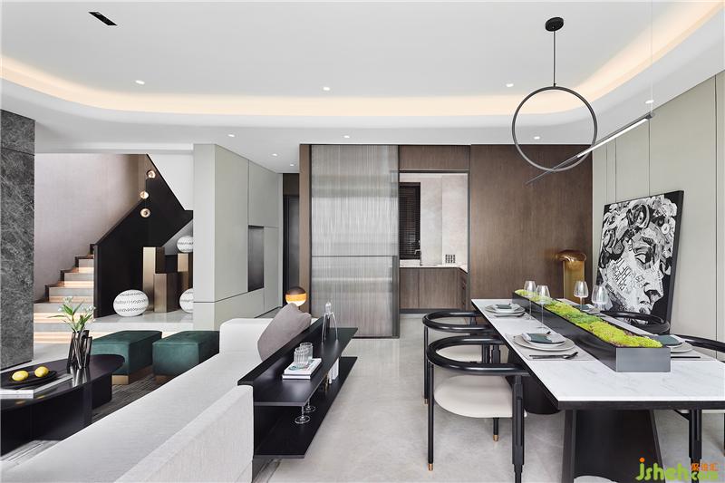 廚房以木盒子體塊打造而成,玻璃移門(mén)在開(kāi)合之間,保證區(qū)隔的同時(shí)又呈現(xiàn)出多種材料的碰撞之美,給人以無(wú)限遐想。復(fù)式裝修設(shè)計(jì)