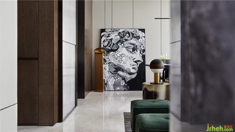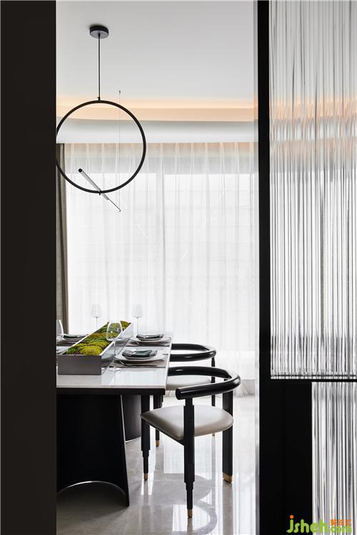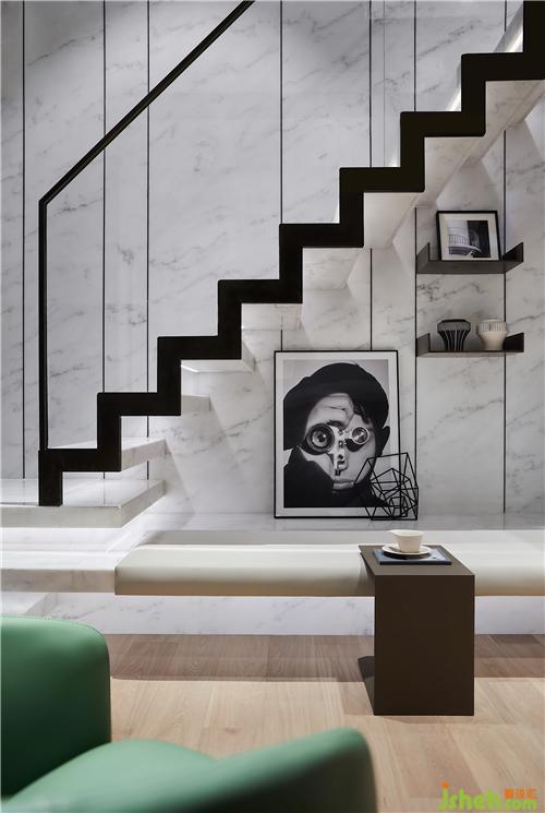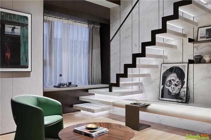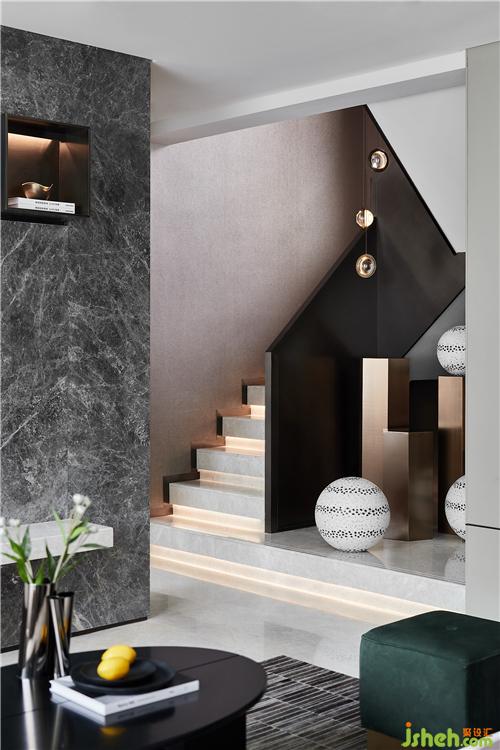 樓梯以平臺(tái)延伸的形態(tài)充當(dāng)踏步的前奏,柱體和球狀的組合關(guān)系,也延續(xù)了積木盒子的概念,在嫻熟的結(jié)構(gòu)處理中演繹場(chǎng)域的力量與美感。隨一體下垂的吊燈盤(pán)旋而上,似乎離幸福也更近了。