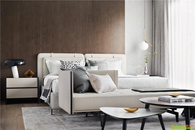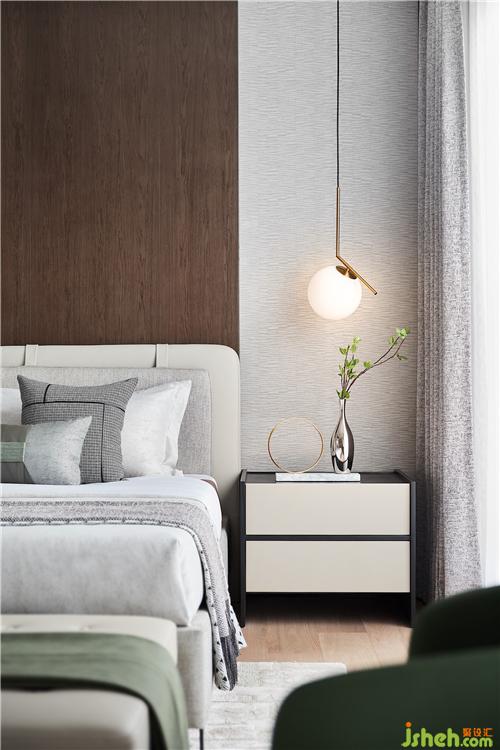 溫潤(rùn)的木與柔和的米色調(diào)鋪陳主臥睡眠區(qū),散發(fā)出一種雅致溫馨的韻味,藉由皮革、布藝與木質(zhì)自如融合,予人安心怡然之感。復(fù)式裝修設(shè)計(jì)