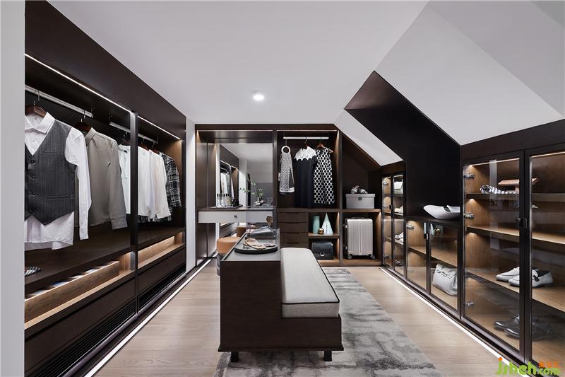 頂部閣樓因勢(shì)化身為專(zhuān)屬衣帽間,實(shí)現(xiàn)對(duì)閑置區(qū)域的最大化利用,也力求功用與美學(xué)的完美融合。陳列分區(qū)理性而細(xì)致,斜頂洞口的開(kāi)啟,及燈帶的適宜設(shè)置,彰顯出細(xì)膩的柔情與不俗的品味。