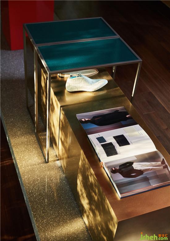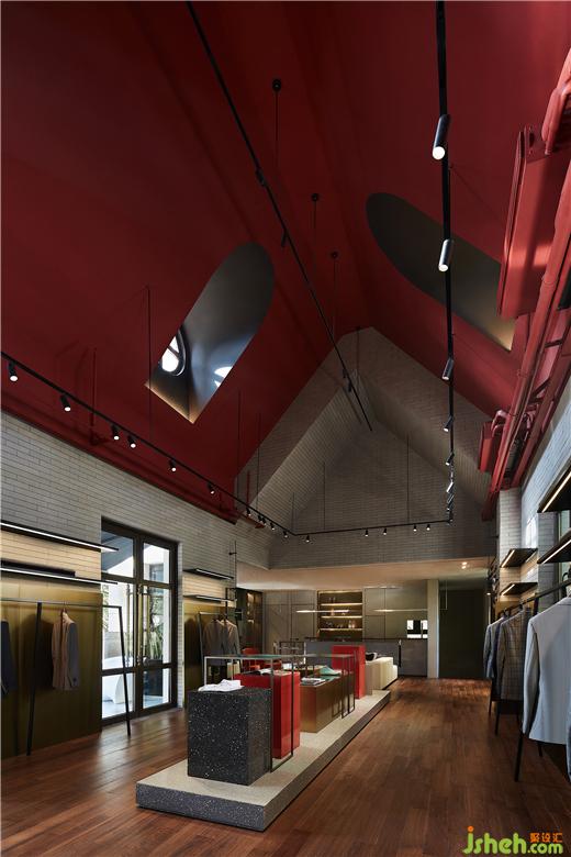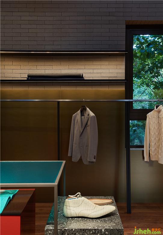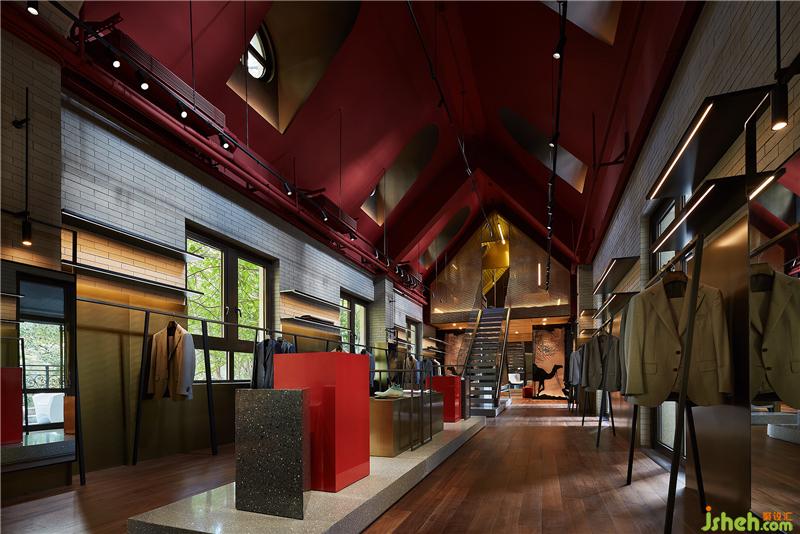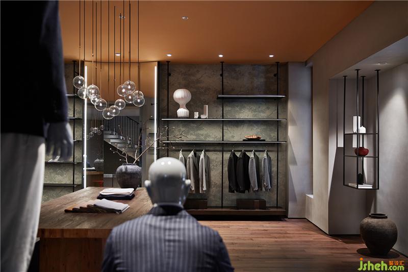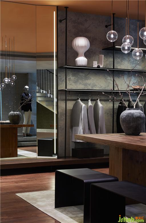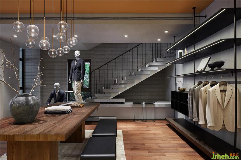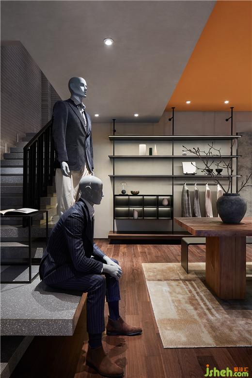 在樓梯處將園林景觀手法借鑒遷入,試圖刻畫出山巒層疊之狀。服裝店設計既滿足上下層連接,又拿捏處理層級關系并使之與產品展示相結合,在這一隅構造焦點模特區(qū)域。