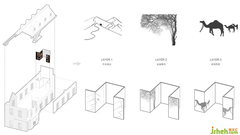 樓梯間通過解構手法,以洞口與金屬燈飾的體塊穿插造景,簡練有力、又耐人尋味。循此前往即將踏上“絲綢之路”,邂逅萬千情致。
