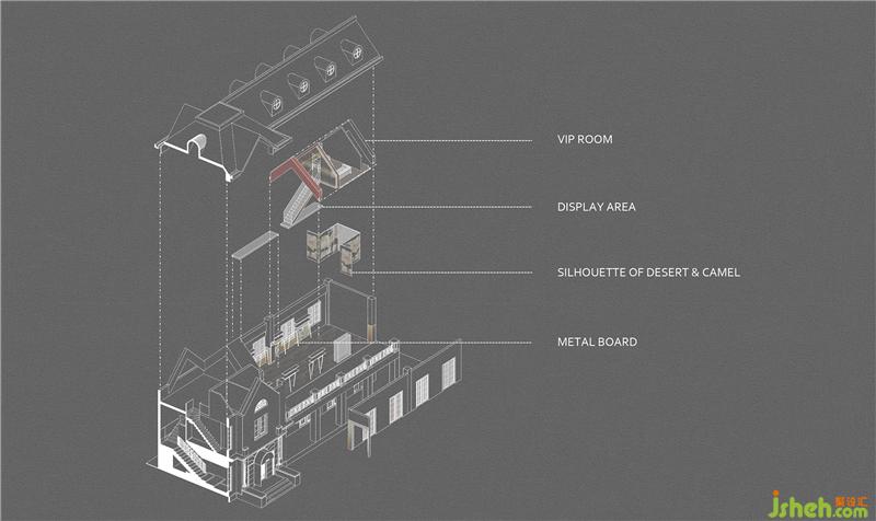不遠處的紅色斜頂與金色盒子的搭配,則讓歷史與舞臺元素彰顯得更加濃烈。VIP室采用懸空式展現(xiàn),仿佛駝峰的外化,又像輝煌的宮殿,這也是絲綢之路主題的進一步完善。
