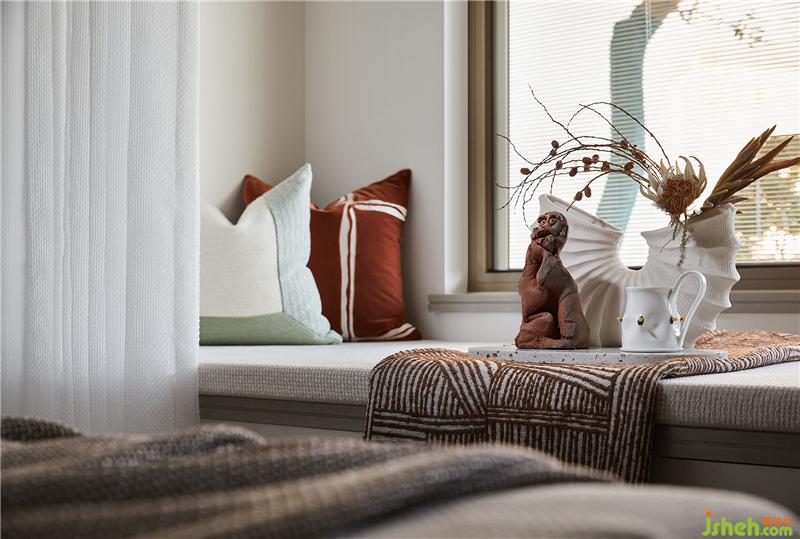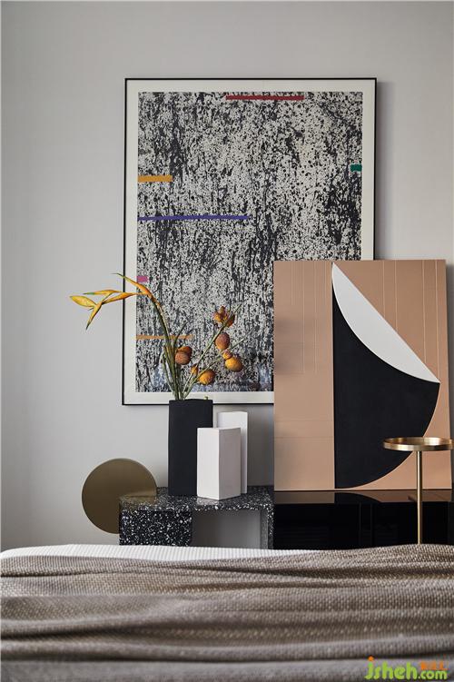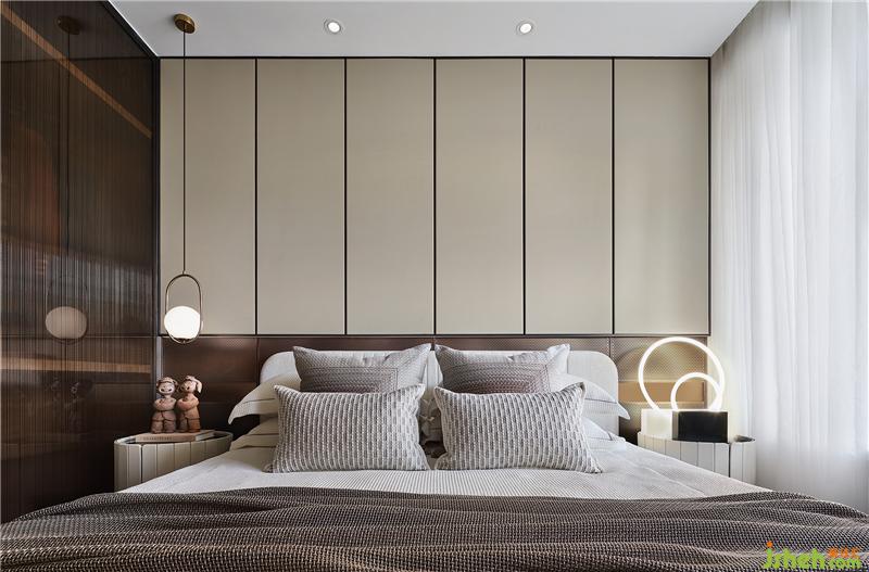 金屬分隔條因勢順延至主臥,天花吊頂采用特意研發(fā)的側(cè)邊發(fā)光槽,床頭則以金屬網(wǎng)的內(nèi)凹形式,呈現(xiàn)更廣闊、豐盈的局面。硬朗的線條與圓潤的軟裝擺件互為襯托,中性的色調(diào)、柔和的觸感,自成一副恬靜之態(tài)。