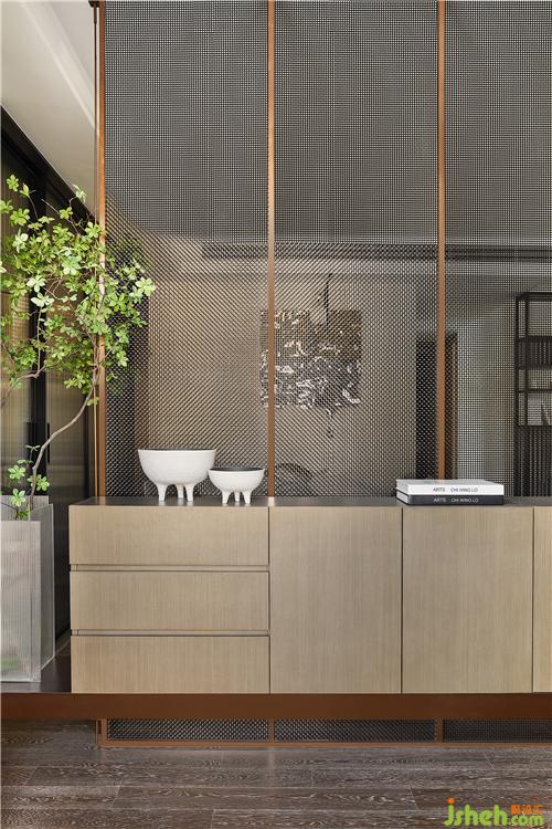 歸家一瞬,別樣的情趣與體貼便撲面而來。金屬網(wǎng)屏風(fēng)與柜體的組合,以自成一景的姿態(tài),隔而不斷,通透與私密并存,功用與美感兼具。隱約間目光亦可探向室內(nèi),意味悠長。