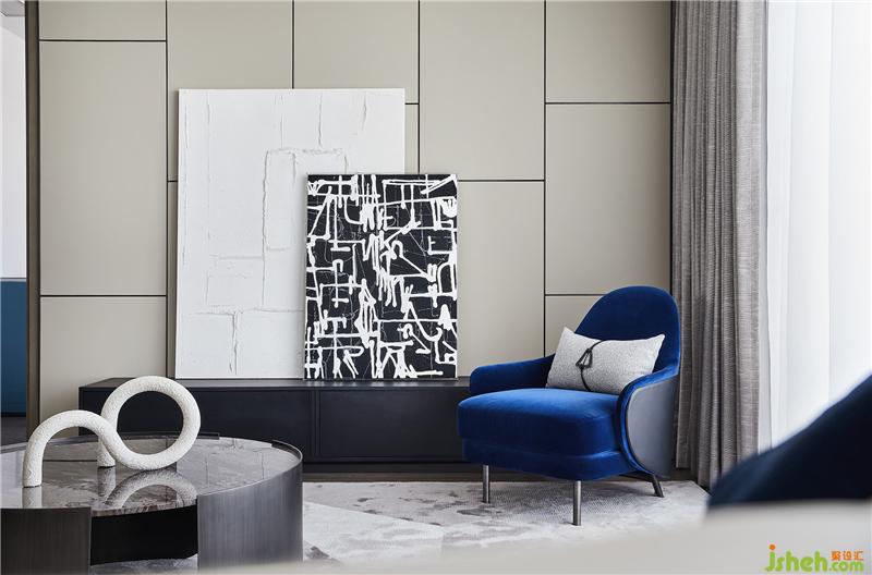 客廳以弧度的沙發(fā)和茶幾渲染輕松氣氛,背景墻通過金屬條進(jìn)行韻律劃分,配合畫作,呈現(xiàn)方正與圓弧的碰撞之美,這也是一種剛?cè)峒鏉?jì)的均衡。
