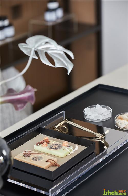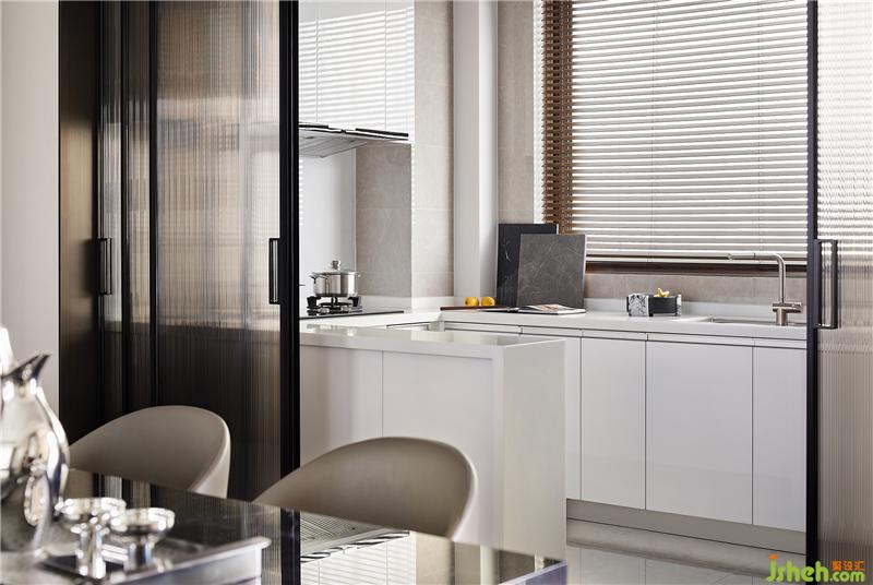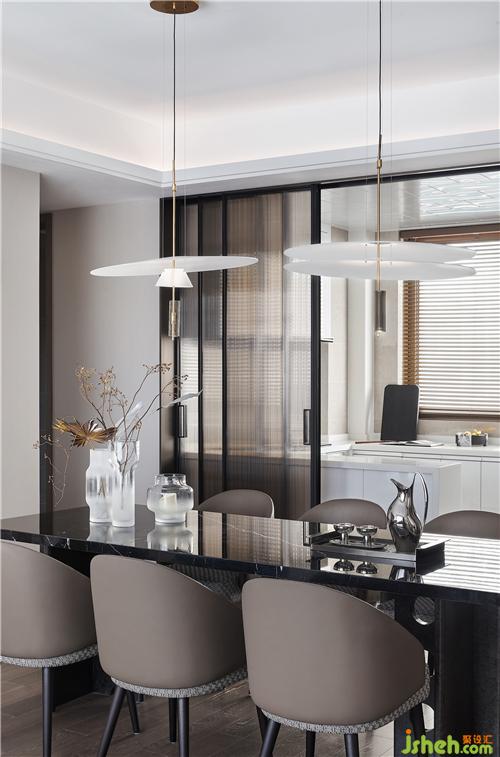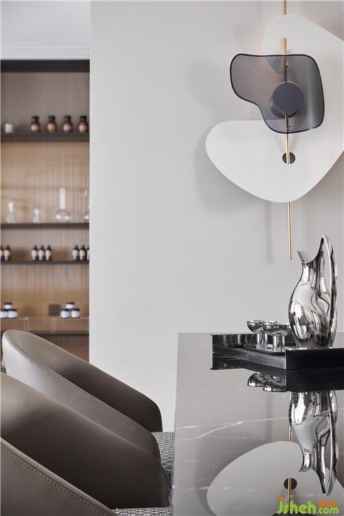精巧的選材、用色在餐廚區(qū)也得以延續(xù),又在輕重、明暗、深淺有別中,形成反差對比。此外,樣板房設(shè)計塑造美觀的同時還注重強(qiáng)調(diào)日常細(xì)節(jié),并以玻璃移門的開合之道勾勒出滿滿的品質(zhì)感與儀式感。