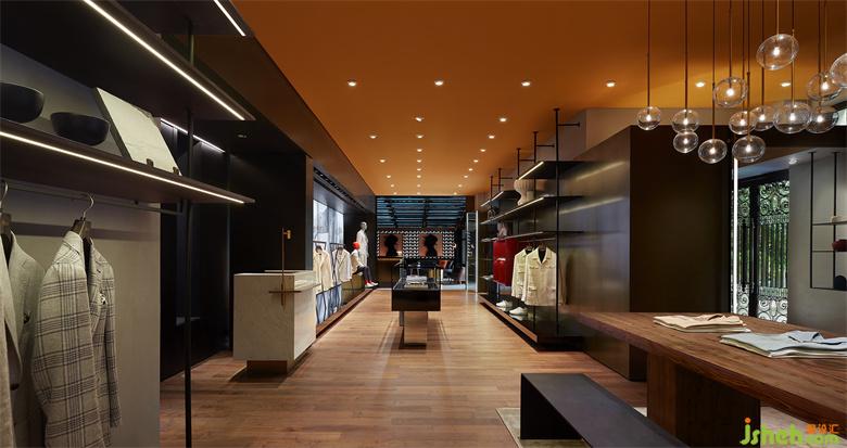 不同的是一面墻體已拆除,頂面一體蔓延向前,一字排開型布局盡顯通透連貫之氣。男裝店鋪設計師注重設計語言的貫徹,強調(diào)材質(zhì)、結(jié)構、色澤的整體性與流暢性,以期達成一期和二期的無縫銜接。