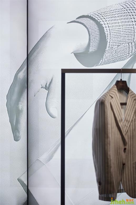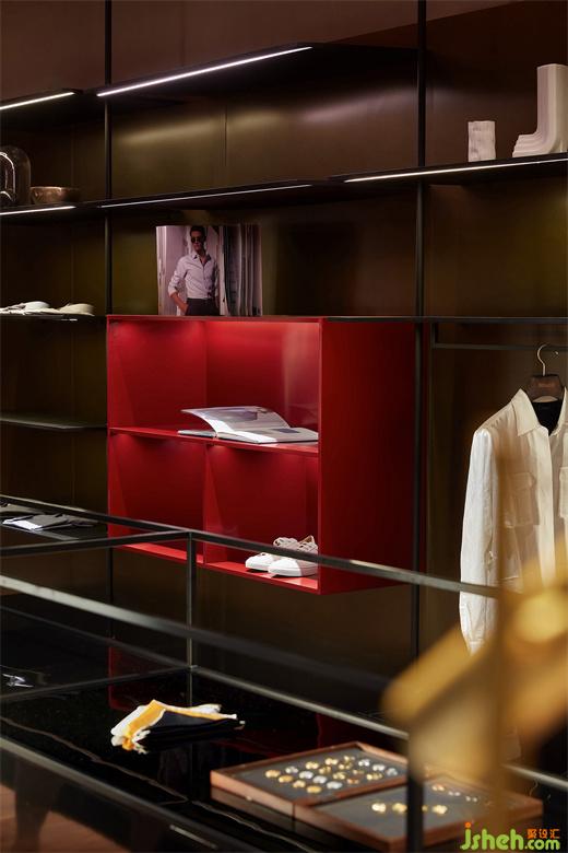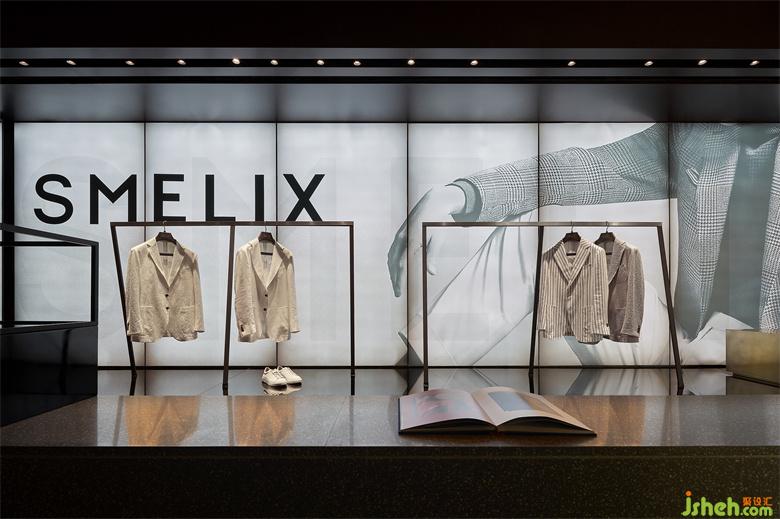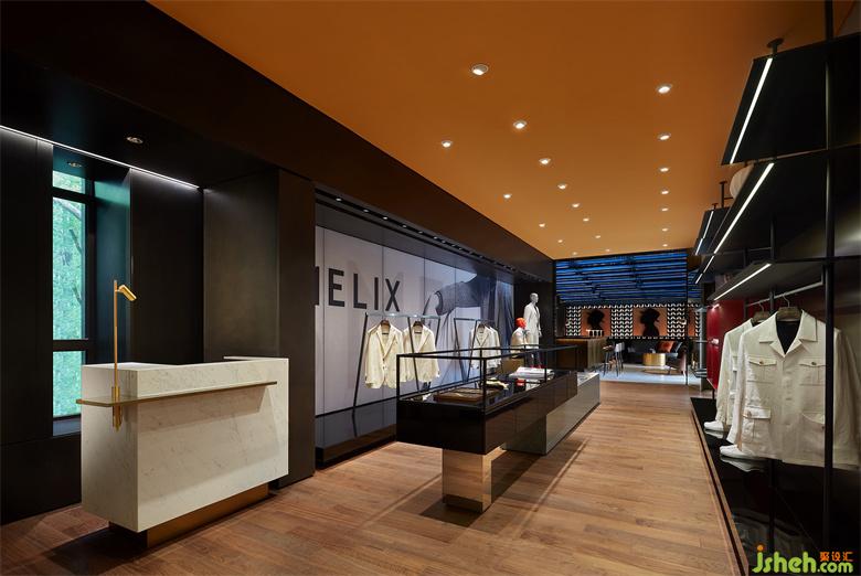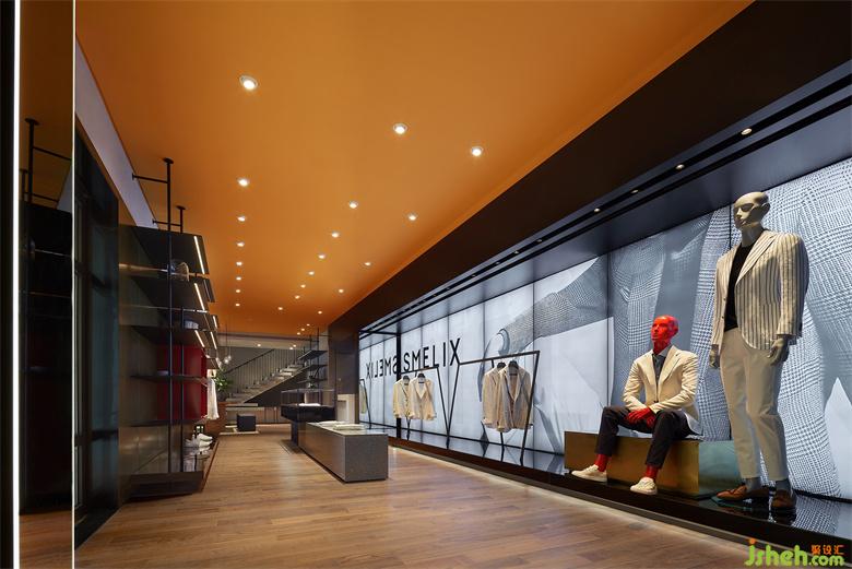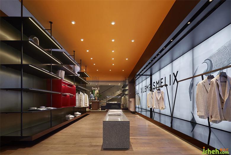 男裝店鋪設(shè)計以內(nèi)凹的BOX體塊,結(jié)合大面燈箱的使用,構(gòu)造出室內(nèi)櫥窗之感。根據(jù)前端的產(chǎn)品陳列樣式,亦可對燈箱實行全色域控制,使二者協(xié)調(diào)契合,另一方面也預(yù)留更多的可塑性。