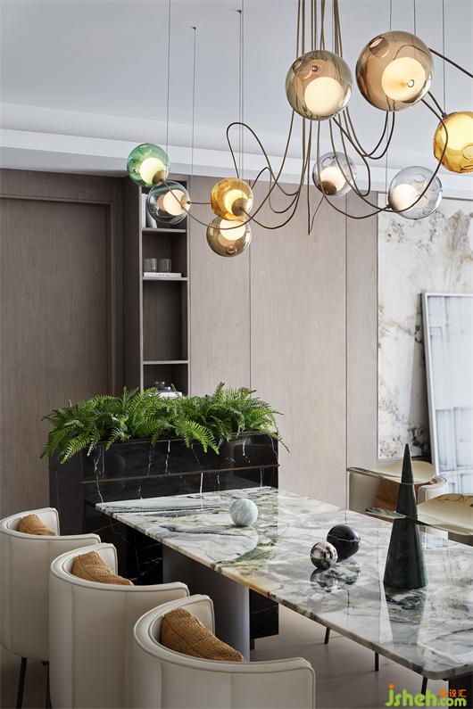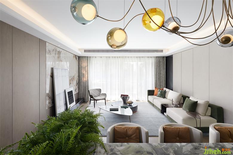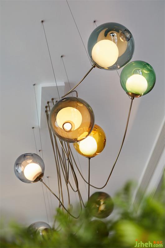 以開放松弛的面貌邂逅歸家之旅,入戶的第一視覺,便能直觀感受到綠意氣息。放眼向上,絢麗多姿的吊燈恰如裝置藝術一般,以奔放律動的身姿開啟熱情的迎接。