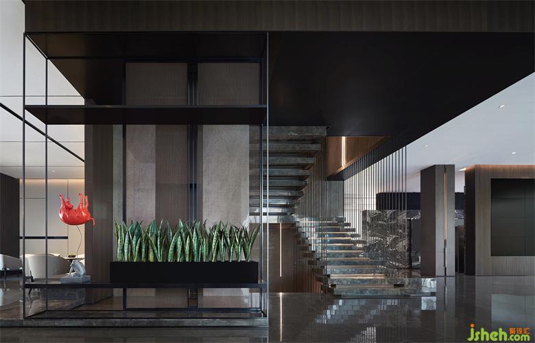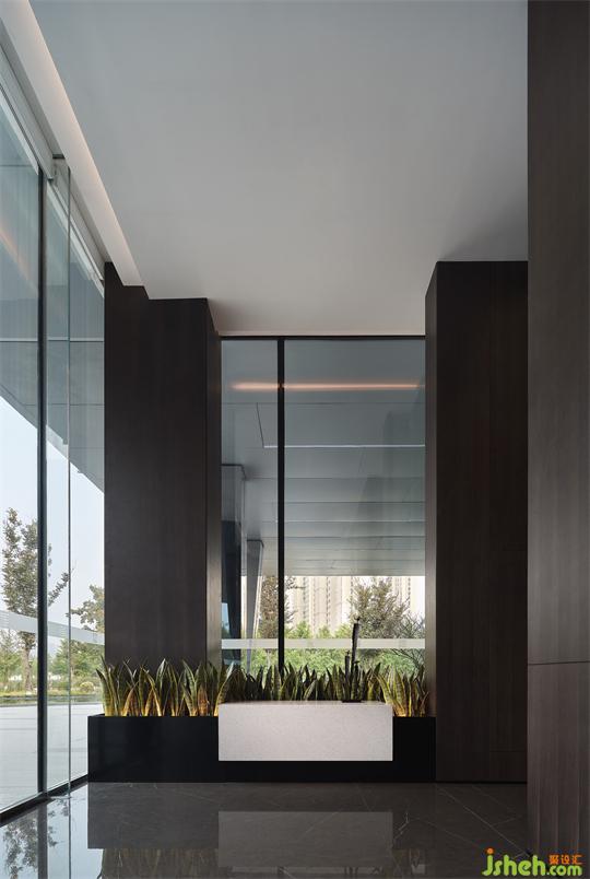 金屬網(wǎng)同樣延伸至電梯處,朦朧的光線和綠植與戶外遙相呼應(yīng),也以潤物細(xì)無聲的方式自成一道風(fēng)景。