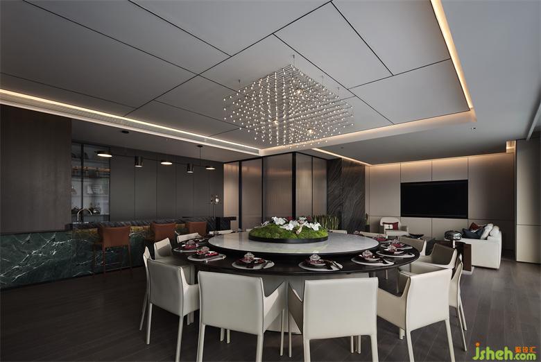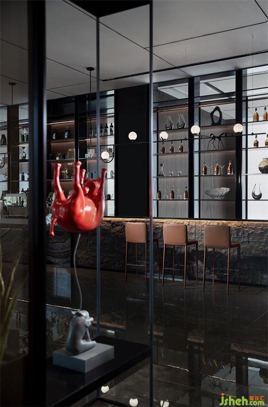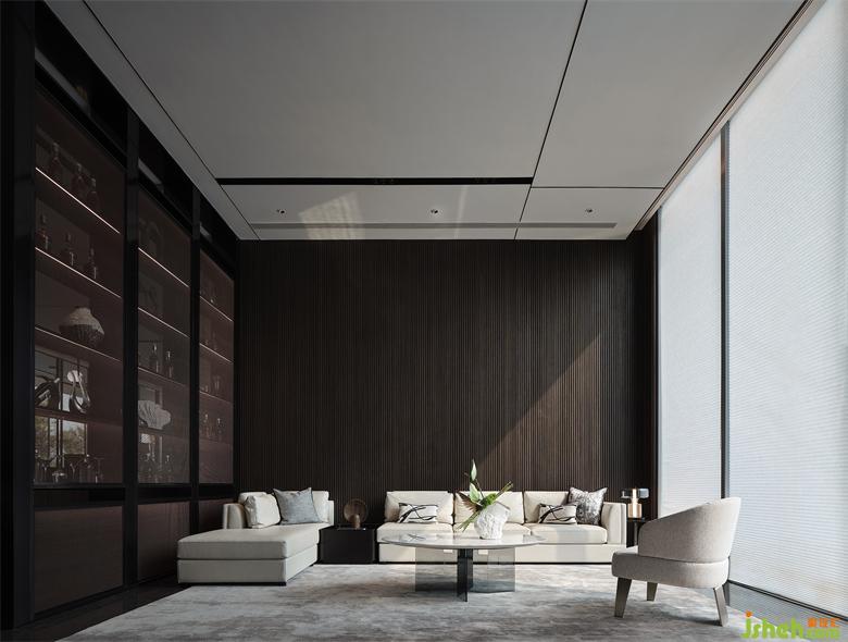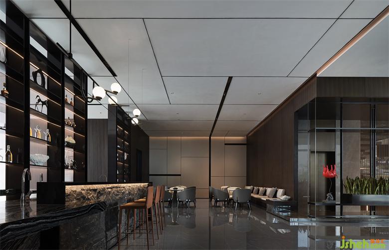 水吧區(qū)域以均衡性作為出發(fā)點(diǎn),拿捏統(tǒng)籌點(diǎn)、線、面、體使其交織互補(bǔ),加上對光的熟稔把控,售樓處設(shè)計(jì)以豐富的質(zhì)感、紋理,共述功用與美學(xué)。
