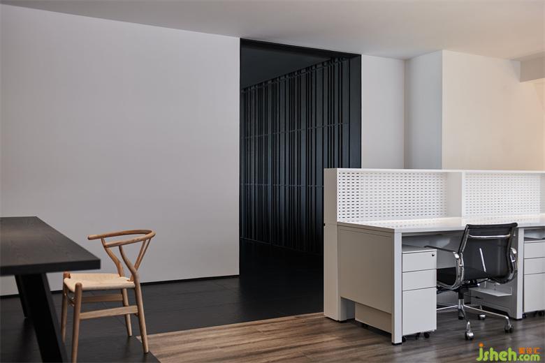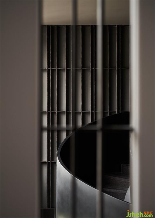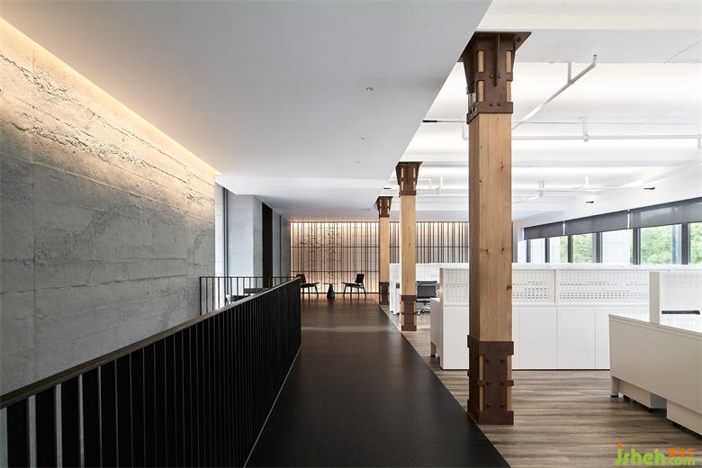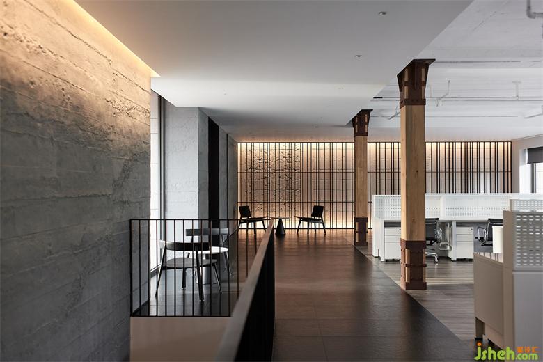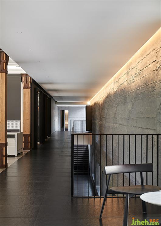 順著圓弧樓梯抵達(dá)二層,兩側(cè)墻體以錯(cuò)位框景打破單調(diào)。連接兩大開放辦公區(qū)的通道隨即映入眼簾,從實(shí)用性考慮,將原本的面寬適度縮減,并設(shè)置整面的暗藏柜體,刪繁就簡,旨在帶來更優(yōu)功用。
