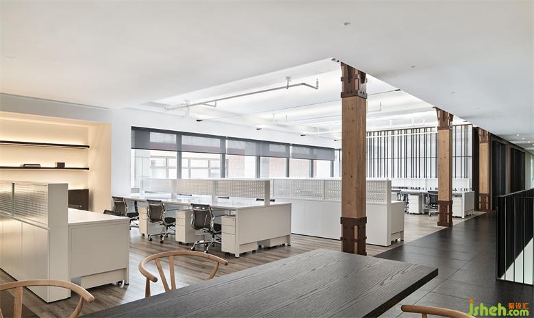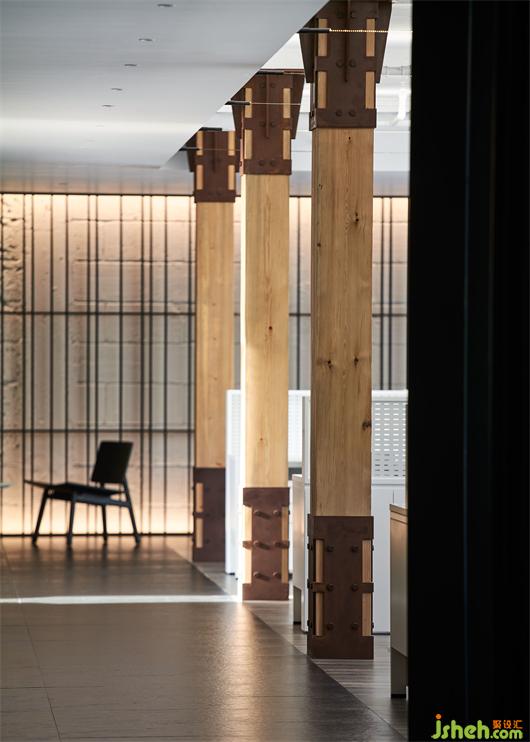 辦公室設(shè)計(jì)對原有立柱進(jìn)行規(guī)整并合理增設(shè)表皮裝飾,映襯出一絲絲的英倫工業(yè)風(fēng),饒有情趣?!拔覀兿胍獱I造一種微妙的反差感,移步換景之間,能感受到新舊融合、時(shí)光交疊的美學(xué)深度?!狈嚼谘a(bǔ)充道。