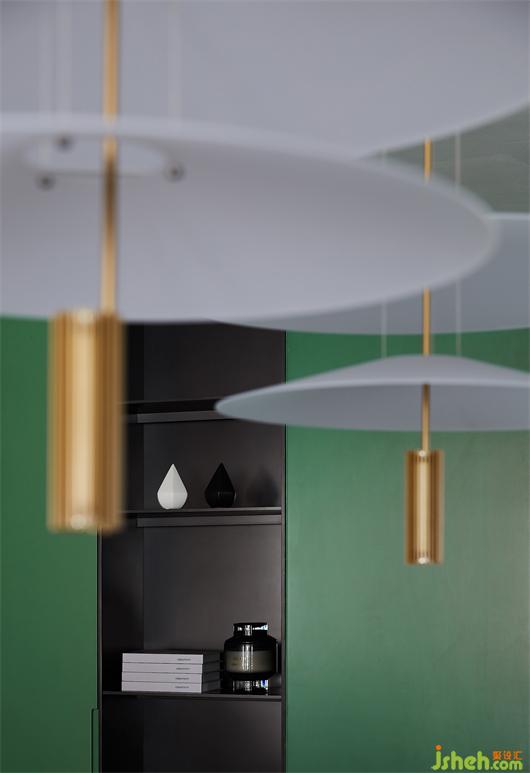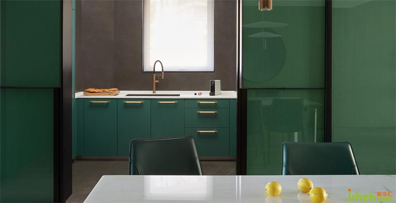 雙開式推拉移門形成隔斷,綠色則繼續(xù)向廚房?jī)?nèi)部延伸,在大片透明玻璃的映襯下,開放度、整體性與互動(dòng)性于此展現(xiàn)。