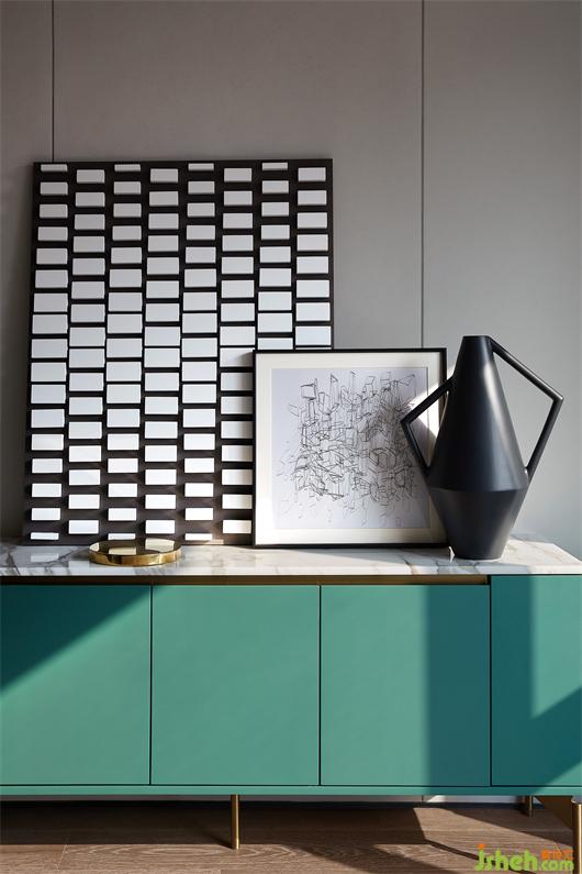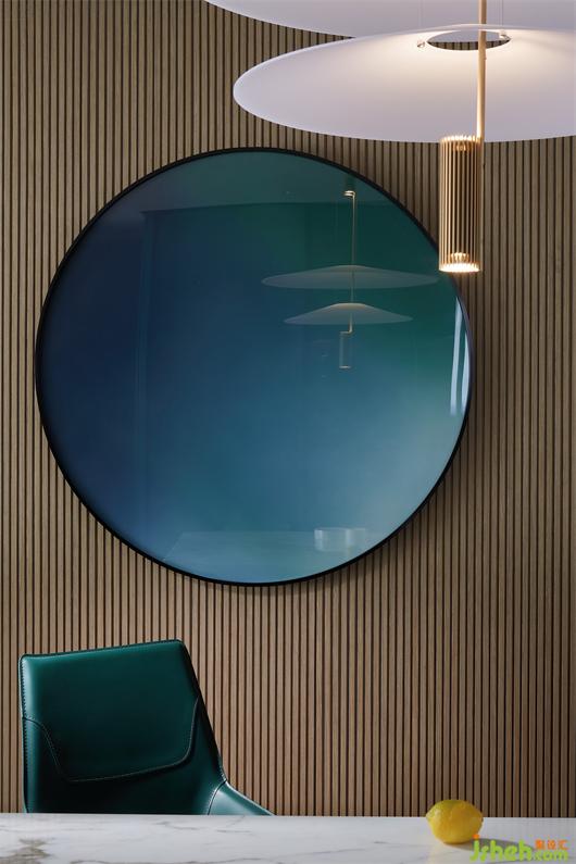 樣板間設(shè)計(jì)為避免零碎雜亂,木百葉由餐廳延伸至客廳,配合恰當(dāng)?shù)陌甸T處理,強(qiáng)調(diào)純粹、整體性的設(shè)計(jì)思維。此外,選以畫作疊加其上,考究其形、色、質(zhì),既有起伏變化,又協(xié)調(diào)統(tǒng)一。