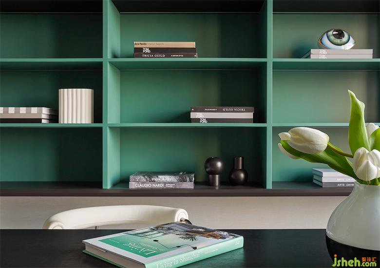 精神疆域的豐盈也是樣板間設(shè)計(jì)追求之一,書房?jī)?nèi)規(guī)整的半吊柜空懸,不規(guī)則書桌與地毯的契合使用,加以個(gè)性藏品的點(diǎn)綴,凝練著思維廣度與高雅氣質(zhì),在此辦公與收藏兩者皆可全。