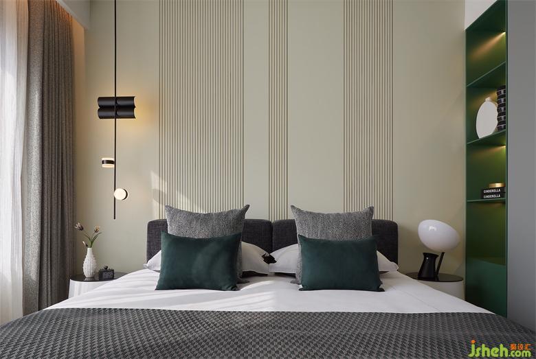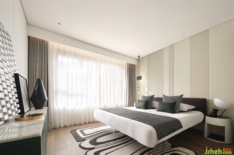主臥床背景以質(zhì)樸有序的線條加上適當(dāng)?shù)牧舭?,極富韻律,給人松弛平靜之感。樣板間設(shè)計(jì)半懸浮的床體工藝頗為考究,打破常規(guī)認(rèn)知,在承重與輕盈的最大化平衡中,帶來無限暢想與別樣情趣。