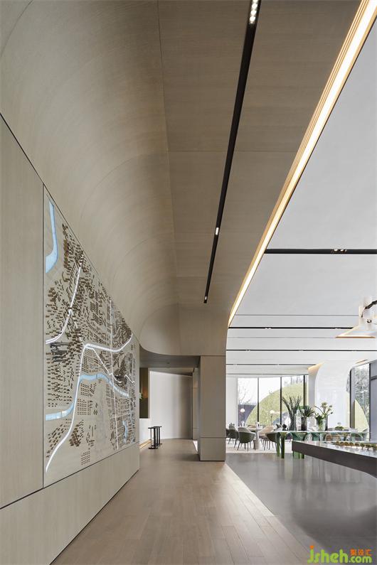 值得一提的是,區(qū)位圖鑲嵌于一側(cè)立面,精湛的木雕工藝使其宛如一幅打開的畫卷,南京售樓處設計展示出這片土地的格局與繁華、沉淀與堅守。它既和木質(zhì)背景形成契合的完整表達,同時又自成主體,承載起極為重要的功能屬性。