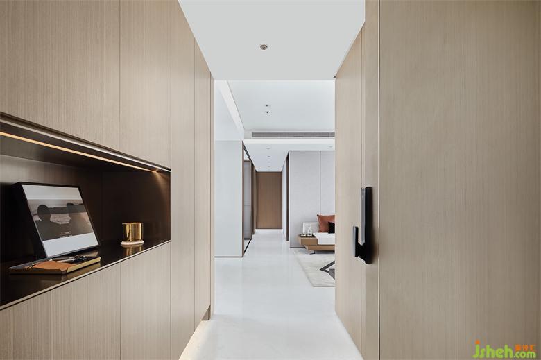 南京樣板間設(shè)計(jì)背景墻一面以線型分割來增添韻律,另一面則巧妙處理不同材質(zhì)的交輝疊加,映襯出懸浮輕盈感,彼此相望,大塊面之中又不乏細(xì)微的變化,不俗品味悄然釋放。