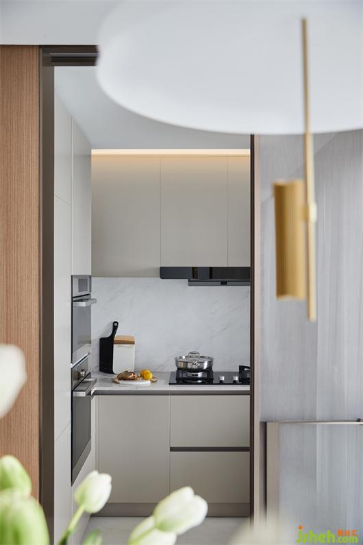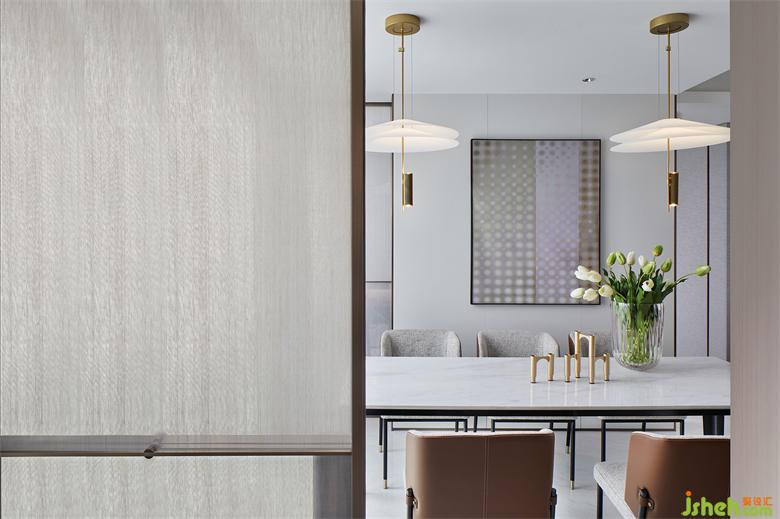流動(dòng)的美感與酣暢的呼吸在餐廳處得以充分體現(xiàn),作為中樞所在,它被客廳、廚房與書房自由地圍繞,彼此功能完整之余,還保證互動(dòng)交流性,切實(shí)關(guān)照居住體驗(yàn)。