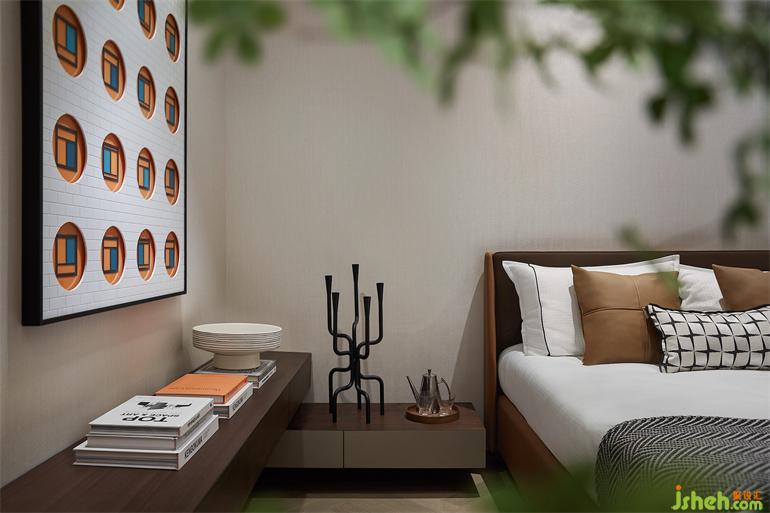 主臥套間延襲主體基調(diào),南京樣板間設(shè)計(jì)以簡而有序的藝術(shù)形式著筆,橙色貫穿始終,除卻外在的視覺呈現(xiàn),更有內(nèi)核的格調(diào)追求。地板采用人字拼手法凸顯層次,其趣味美感與細(xì)節(jié)推敲更顯設(shè)計(jì)功力。
