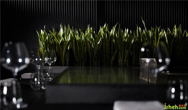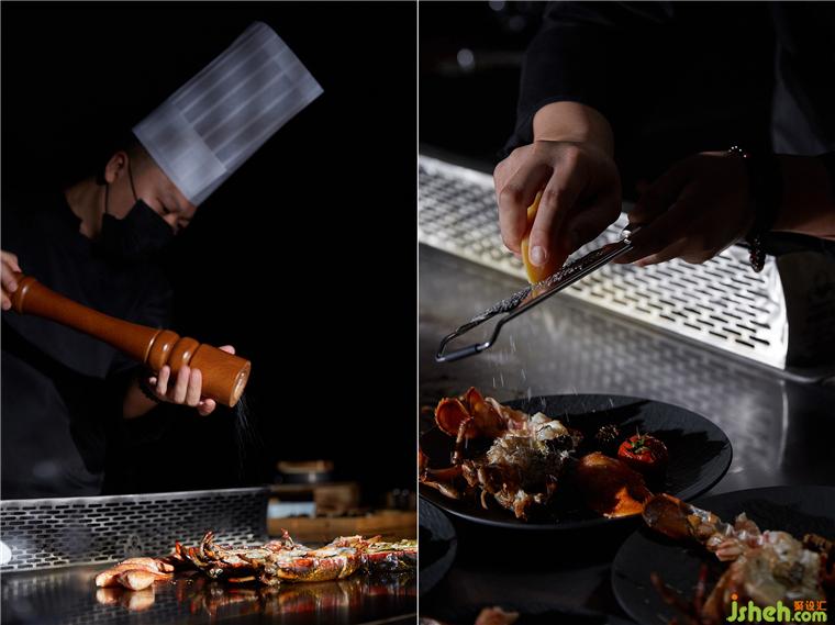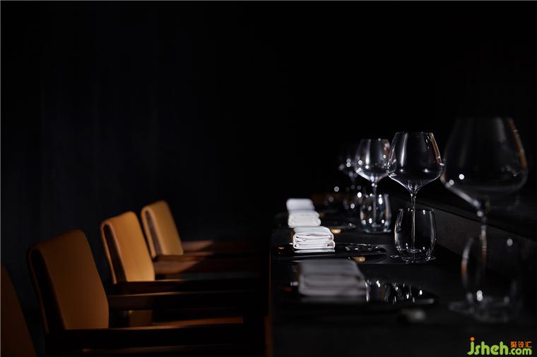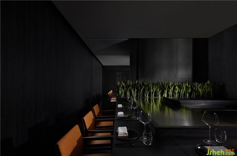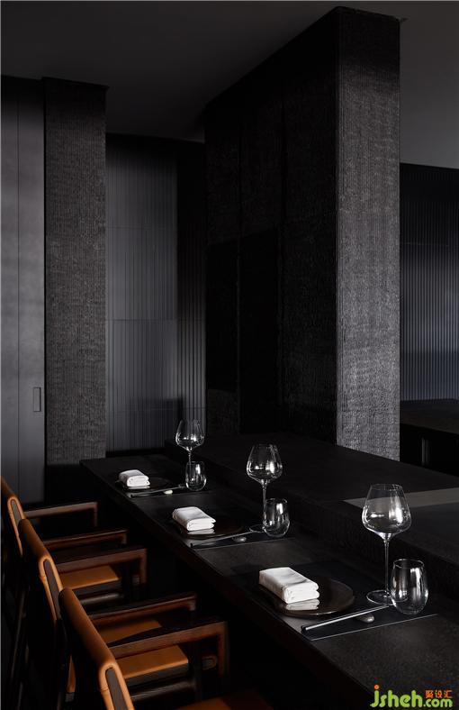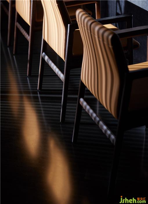 整個(gè)就餐區(qū)色調(diào)統(tǒng)一,間或些許跳色,木質(zhì)、石材、金屬、皮革等相互碰撞,近可感受肌理質(zhì)感,遠(yuǎn)能一覽結(jié)構(gòu)輪廓,鐵板燒餐廳設(shè)計(jì)在光線和視角的轉(zhuǎn)換之下,意味深長。