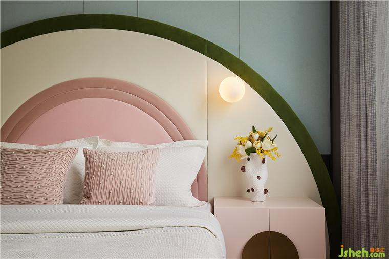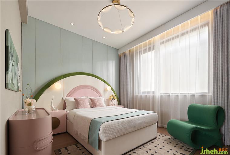 以童趣視角作為情感鏈接,兒童房巧用馬卡龍色系,細膩的粉、生機的綠、樣板間設(shè)計以及柔和的藍,配合靈動的造型,以此進一步引導(dǎo)多元感知。