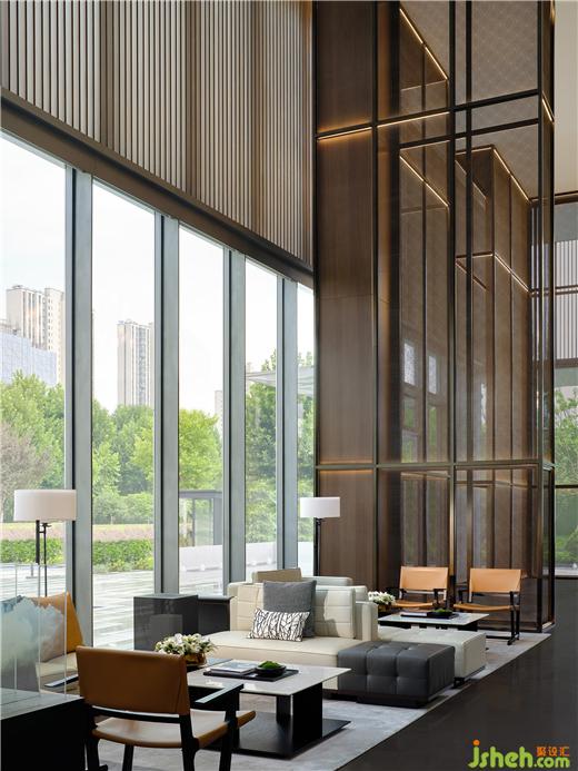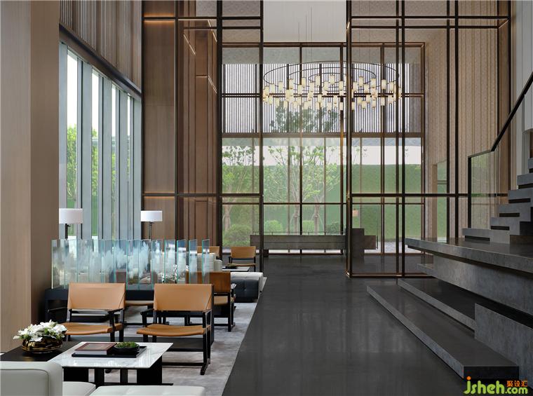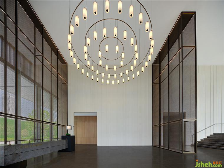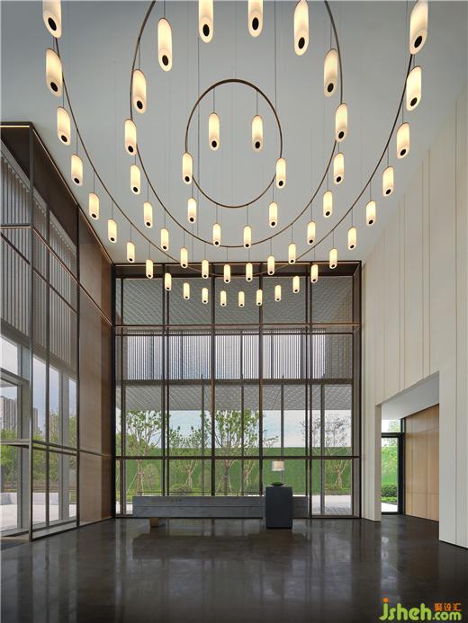 高挑空前廳內(nèi)的定制金屬屏風(fēng)、木百葉與石材悄然間流露著東方意蘊(yùn),明朗且舒緩。售樓處設(shè)計(jì)吊燈則以圓形、線性、陣列式的重復(fù)元素強(qiáng)化儀式感,剛?cè)峒鏉?jì),一派包容之意,氣度非凡。