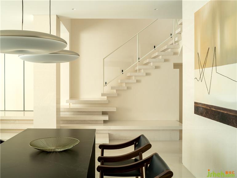 晨昏朝暮,一日三餐,溫情相伴。用餐區(qū)筆觸利落清朗,高低連貫起伏,恰到好處的比例拿捏框定秩序,疊墅設(shè)計啞光與亮面、粗糲與光滑相映生輝,于率性中也勾勒著儀式感。