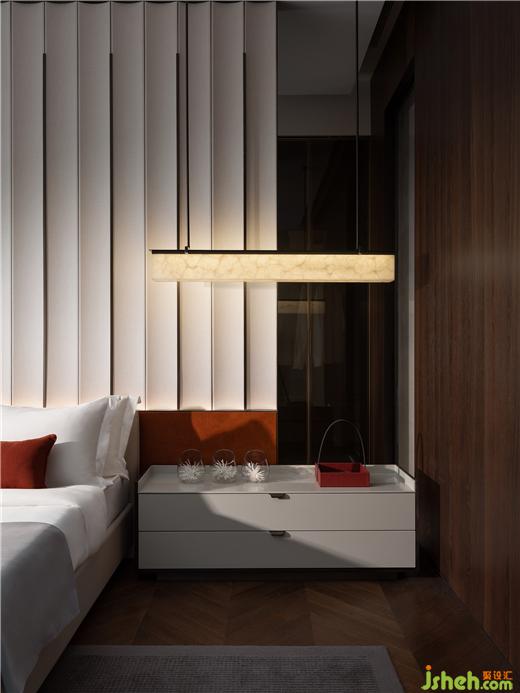 酒店式居住感受,切實(shí)落筆在體驗(yàn)層面,主臥套間可謂對(duì)此深度踐行。常州天安別墅設(shè)計(jì)主背景顯著的線條韻律、內(nèi)凹的弧度極具包容撫慰之感,清晰可見其與一樓一脈相承之意。非對(duì)稱的床頭柜設(shè)計(jì),也蘊(yùn)含著對(duì)上下體量、前后交互的思考。搭配兩側(cè)留白,提升感官的從容呼吸。