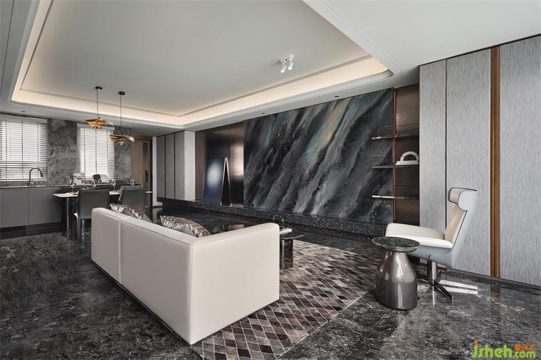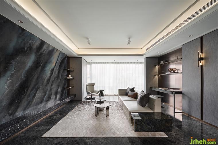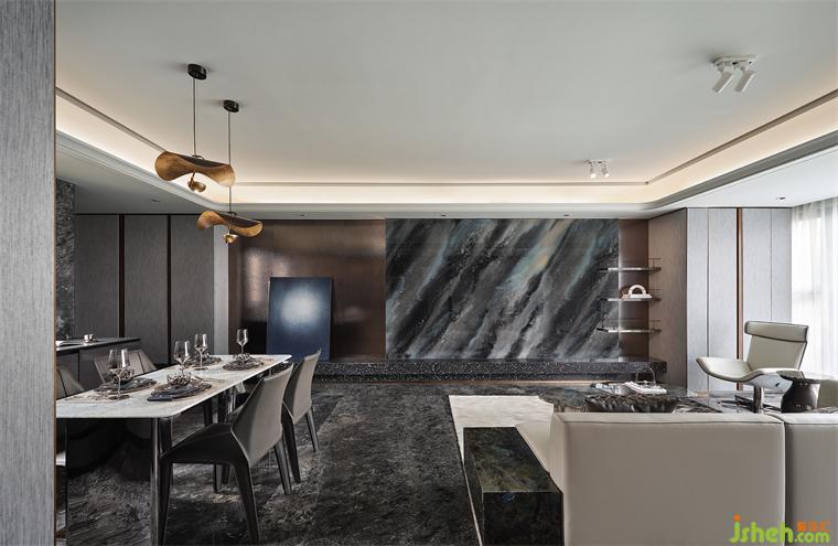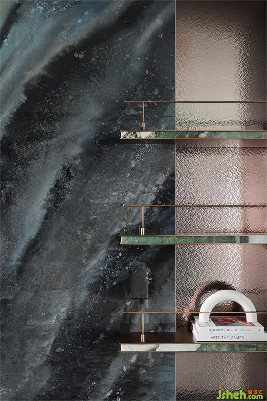 精選奢石巖板化身背景墻,與金屬波紋板相得益彰,輔以古銅金屬格架與勾縫的點綴增添細(xì)節(jié)與亮點,樣板間設(shè)計共同碰撞出獨特的低奢格調(diào)。
