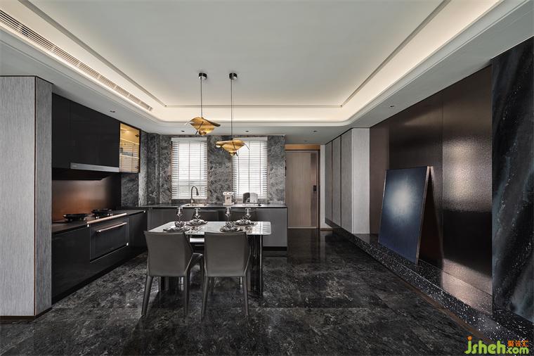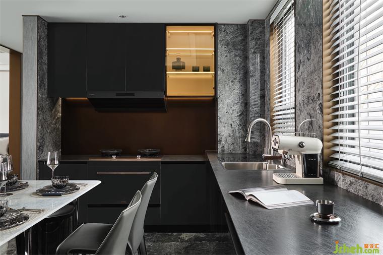 通透的布局讓公共場域承擔(dān)社交凝聚的重?fù)?dān),大面積灰色花紋石材的使用,打破傳統(tǒng)功能分區(qū)界限,也賦予餐廚區(qū)更高的匹配度與適用性。這不止是物理上的空間關(guān)系,更是情感深處的共鳴與調(diào)動。