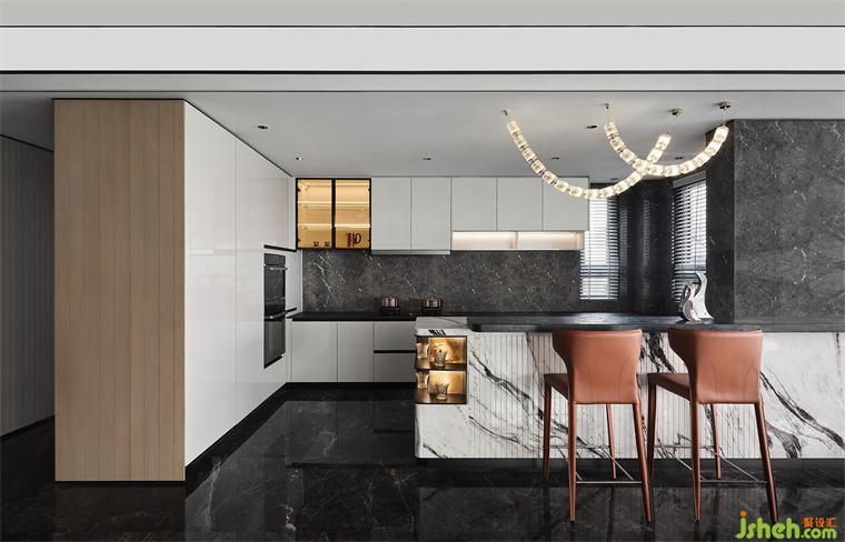 吧臺(tái)充當(dāng)著客廳與廚房的媒介,進(jìn)一步擴(kuò)充著室內(nèi)橫向上的關(guān)聯(lián)與層次。樣板間設(shè)計(jì)線條與體塊交錯(cuò)、明暗共生、曲直組合,以實(shí)際需求出發(fā),滿足功用并創(chuàng)造出豐富的感知。