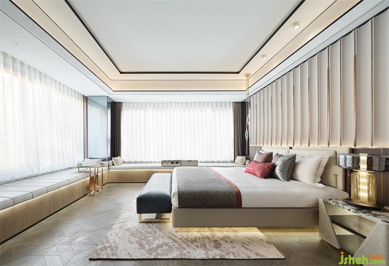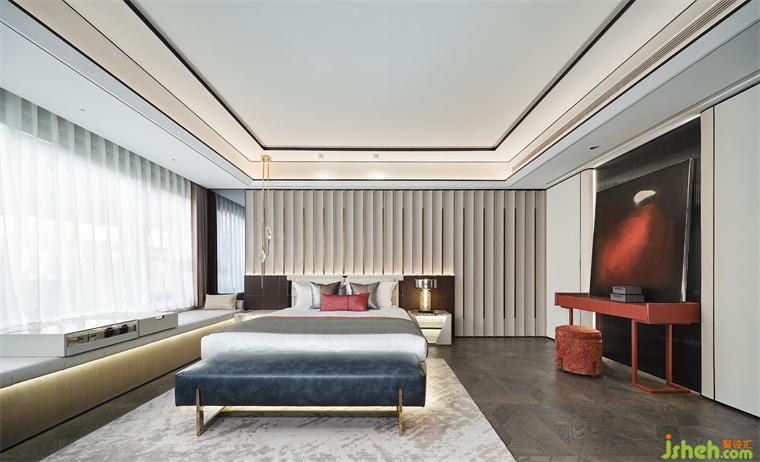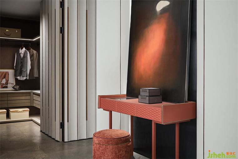 作為私密的棲居之地,主臥套間背景墻使用藝術(shù)皮革與金屬,樣板間設(shè)計(jì)賦予其鮮明的韻律之美,弧度內(nèi)凹成型,柔和包裹酣然入眠。衣帽間采用暗門設(shè)計(jì),并與床背景融為一體,以流暢的細(xì)節(jié)傳遞居住的內(nèi)核。270°轉(zhuǎn)角飄窗,與窗外風(fēng)光愜意相擁,也悄然釋放一種靜謐的奢華。