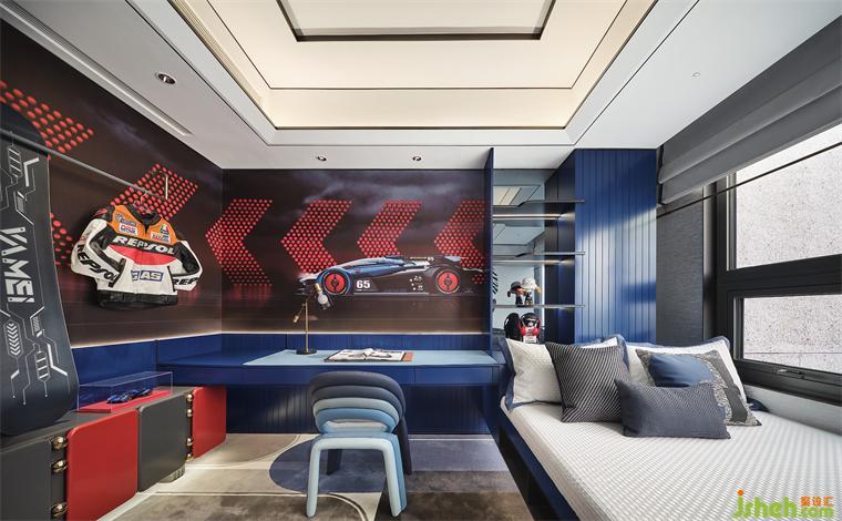 兒童房因勢(shì)利用飄窗,并重新整合結(jié)構(gòu),床體、柜體與書桌渾然一體,俊朗風(fēng)度一覽無(wú)遺。設(shè)計(jì)師引入機(jī)車元素縈繞其中,引擎轟鳴,熱血馳騁,點(diǎn)燃速度與激情。并選用紅藍(lán)撞色搭配,流淌著無(wú)限活力與趣味之感。