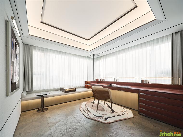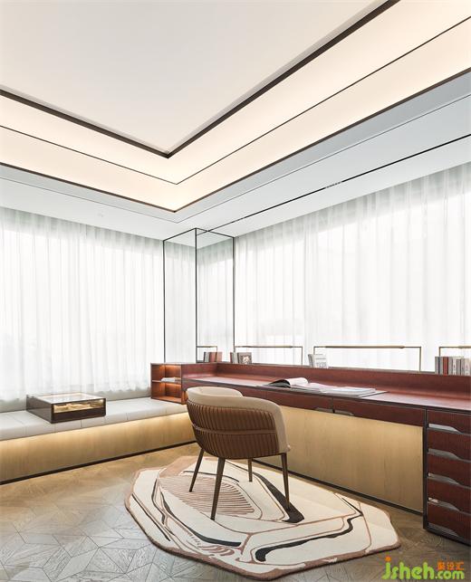 樣板間設(shè)計(jì)通透簡(jiǎn)練的廓形勾勒著書房場(chǎng)域,也蘊(yùn)含著設(shè)計(jì)師對(duì)造型比例的多重思考。落座閱讀,或遠(yuǎn)眺靜思,皆能找到深層情感連接。