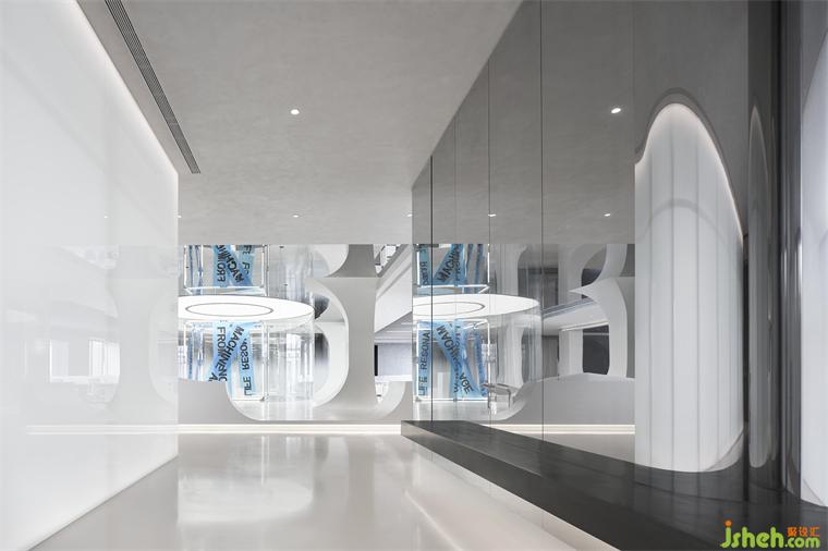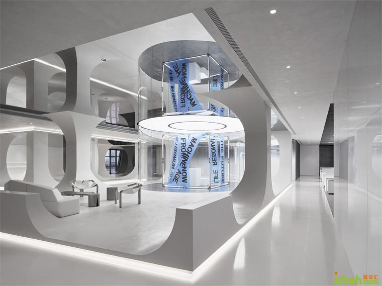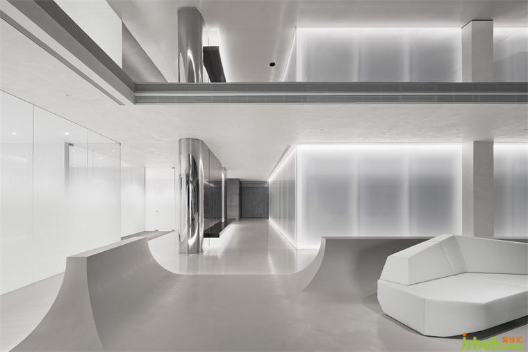 辦公室設計師以洄游動線靈活銜接各功能分區(qū),通過玻璃帷幕圍合中庭,既能過濾外部嘈雜,又不影響采光。原有建筑柱體以鏡面不銹鋼覆蓋,或打造整排收納柜體,或以體塊穿插構建懸浮平臺,賦予多元功用與利落美學。