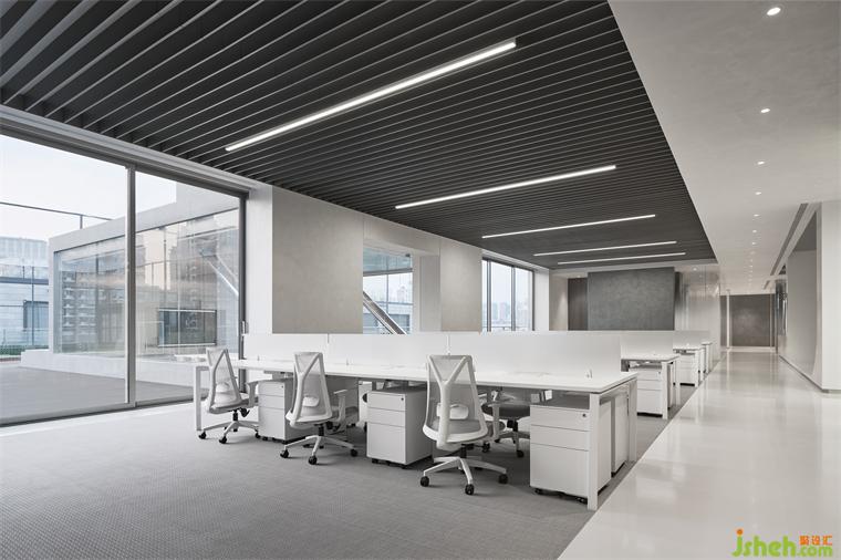 開放辦公區(qū)以大片落地門窗消彌內外邊界,頂面深色格柵一體鋪陳,與地面呼應,更顯通透干練。