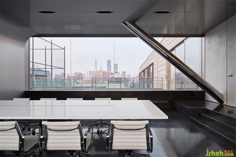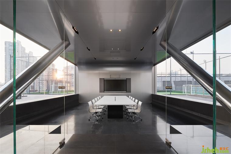 因勢利用原始建筑結構,辦公室設計打造下沉式會議室,頂部鋁板順延而下與地面拼接,立柱也以相同材質包裹,并延續(xù)圓弧細節(jié)。大片落地窗將戶外露臺的休閑、足球場的動感與陸家嘴天際線一并捕捉,于此可窺見都市縮影。