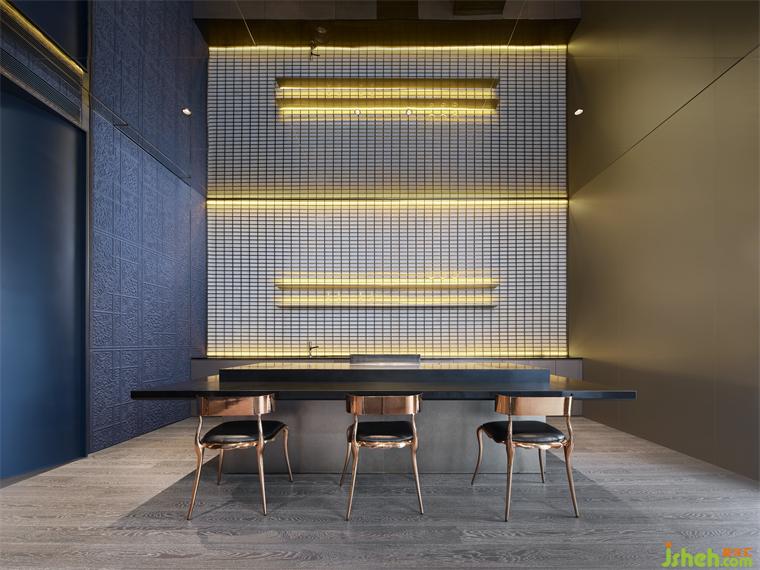 私宴廳延用相同材質(zhì)、造型手法與細(xì)節(jié)處理,以強(qiáng)調(diào)整體統(tǒng)一性。壁布上的連紋圖案恰似浮雕,又于共性之中凸顯一絲個(gè)性。窗外奔流不息的黃浦江,與上海當(dāng)代藝術(shù)博物館折射出新舊共存的城市記憶,也交匯出人與室內(nèi)、環(huán)境的多維情感,塑造獨(dú)特的空間體驗(yàn)。