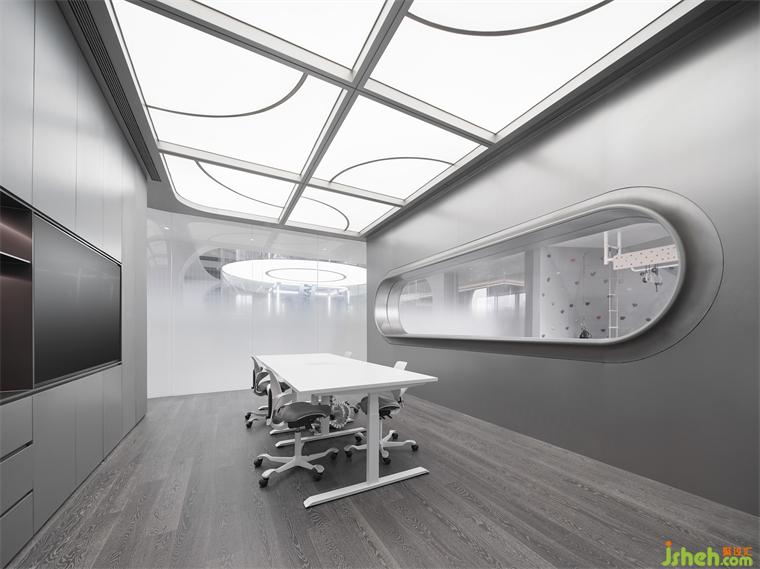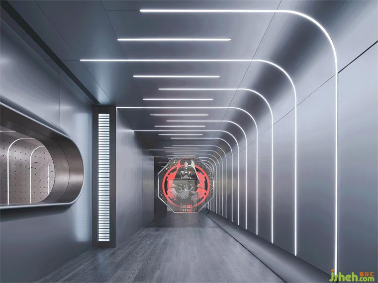 為滿足客戶孩童的學(xué)習(xí)與玩樂需求,還于此設(shè)置文娛活動(dòng)區(qū),包括音樂室、學(xué)習(xí)區(qū)、體能訓(xùn)練區(qū)、攀巖墻等。音樂室從孩童酷愛的“星球大戰(zhàn)”主題中汲取靈感,勾勒太空艙式造型,并于鏡面玻璃之后加入黑武士圖案化身,以多彩變幻的燈帶渲染動(dòng)感酷炫的氛圍。