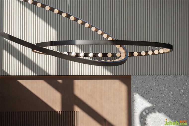 接待區(qū)以利落與禮序相迎,遵循建筑弧形之態(tài)并延用于室內(nèi),配合顯著的線條與細(xì)節(jié)處理,于大氣的塊面關(guān)系中流溢出動(dòng)態(tài)活力與能量。上海展示中心設(shè)計(jì)精心選取的吊燈,無論是外形還是內(nèi)核,都與空間緊密呼應(yīng),鋪墊著和諧的感知度。