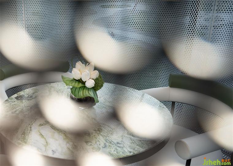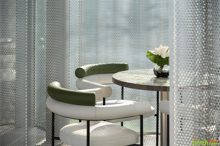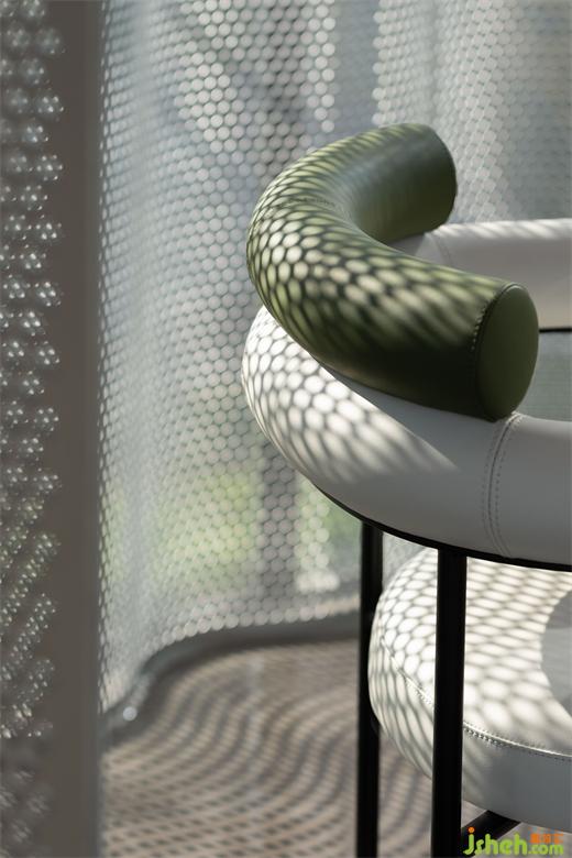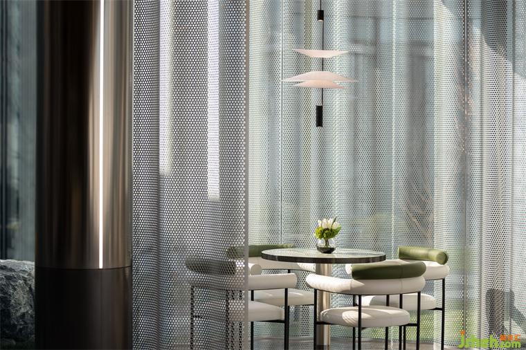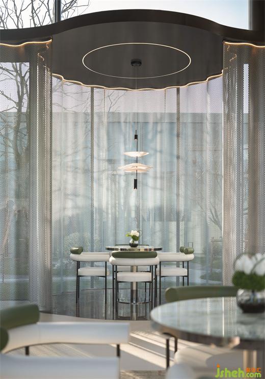 內(nèi)外共生,無界交融。玻璃幕墻將光與景觀引入室內(nèi),面向中庭的半圓弧卡座也仿佛置身自然之中,建筑、景觀與室內(nèi)渾然相融,包裹感和私密性也被有效呵護與滿足。上海展示中心設(shè)計光影婆娑間,捕捉生活的點滴詩意。