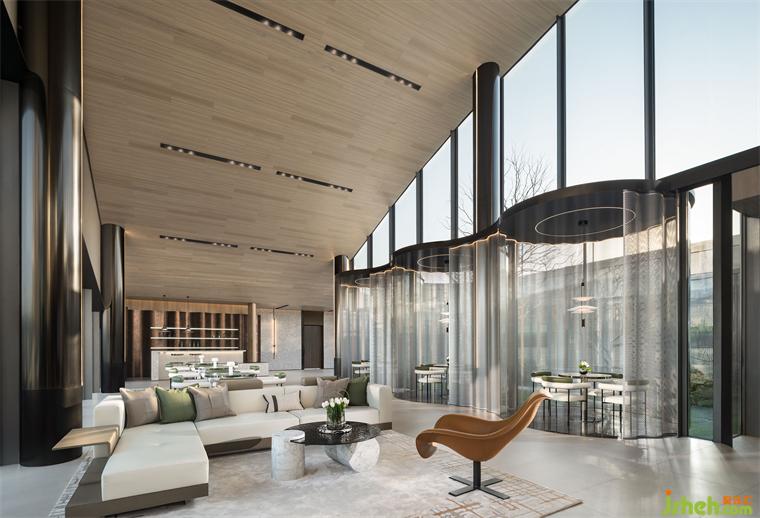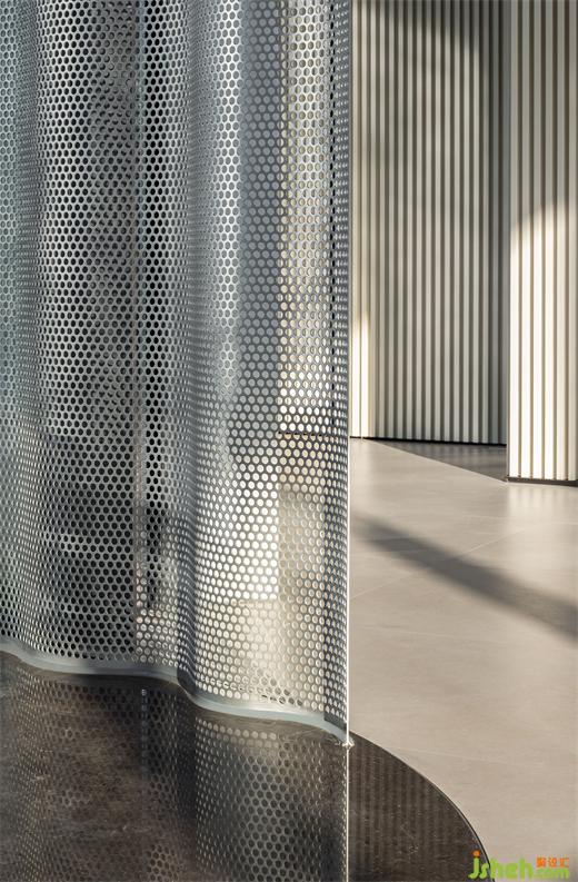 建筑實墻與整片落地門窗的銜接與整合也是設(shè)計師的思考要點。3款木紋鋁板鋪設(shè)于立面及頂面,上海展示中心設(shè)計精細設(shè)置其尺度與拼接方式,在規(guī)整排列中塑造出些許漸變與跳脫形態(tài)。通透生態(tài)的樣貌同樣延續(xù)至洽談區(qū),讓交流更顯愜意與隨性。