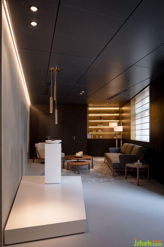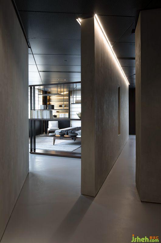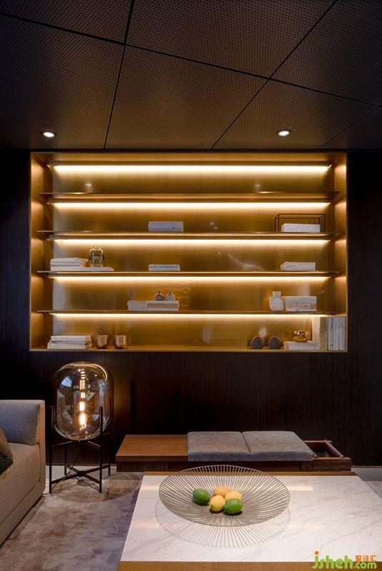 客廳兩端定制的展示架與建筑窗口整體呼應(yīng)統(tǒng)一。巧妙顏色和紋樣的地毯緩解單調(diào),同時緊靠墻面的展臺與臺體、吊燈產(chǎn)生視覺關(guān)聯(lián),通過對產(chǎn)品位置和比例關(guān)系的精準(zhǔn)掌控塑造出客廳的延伸感。